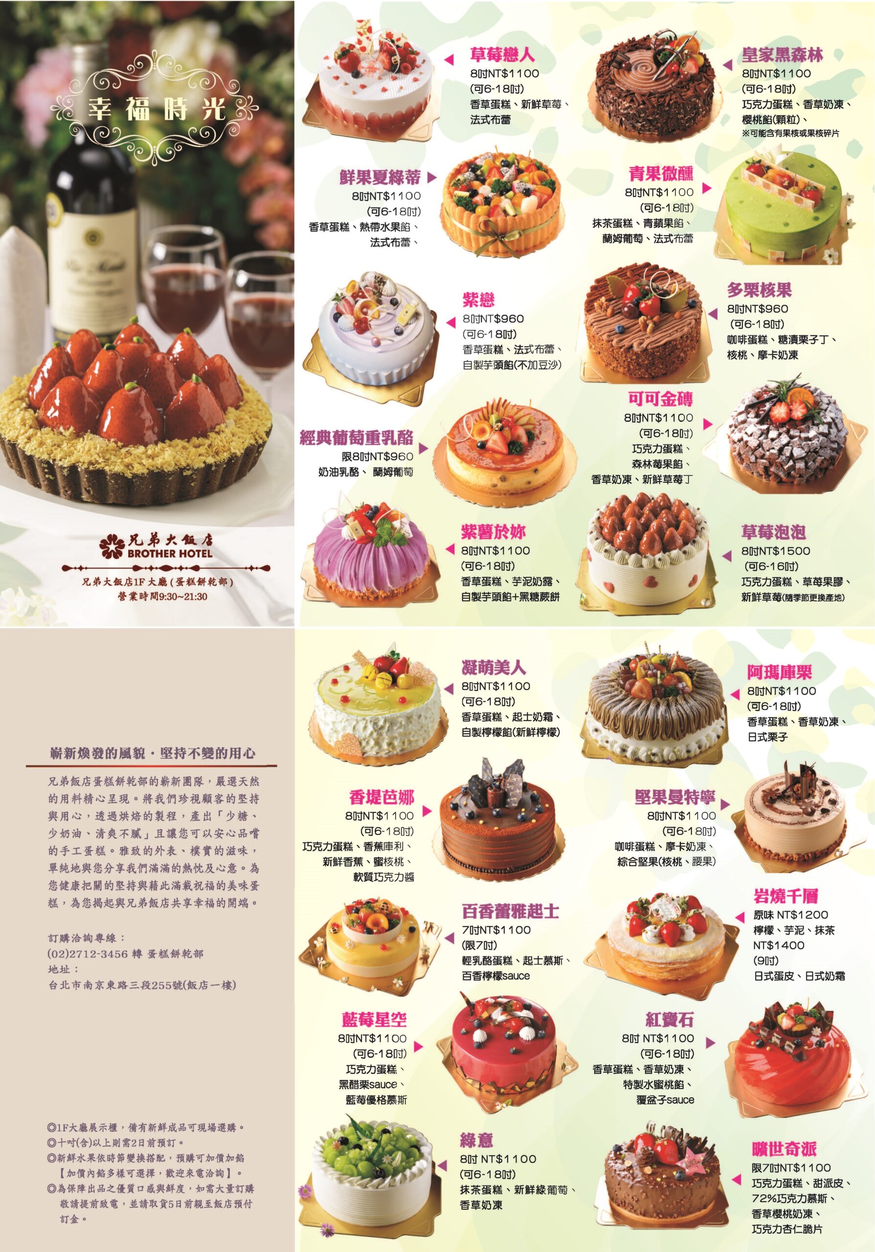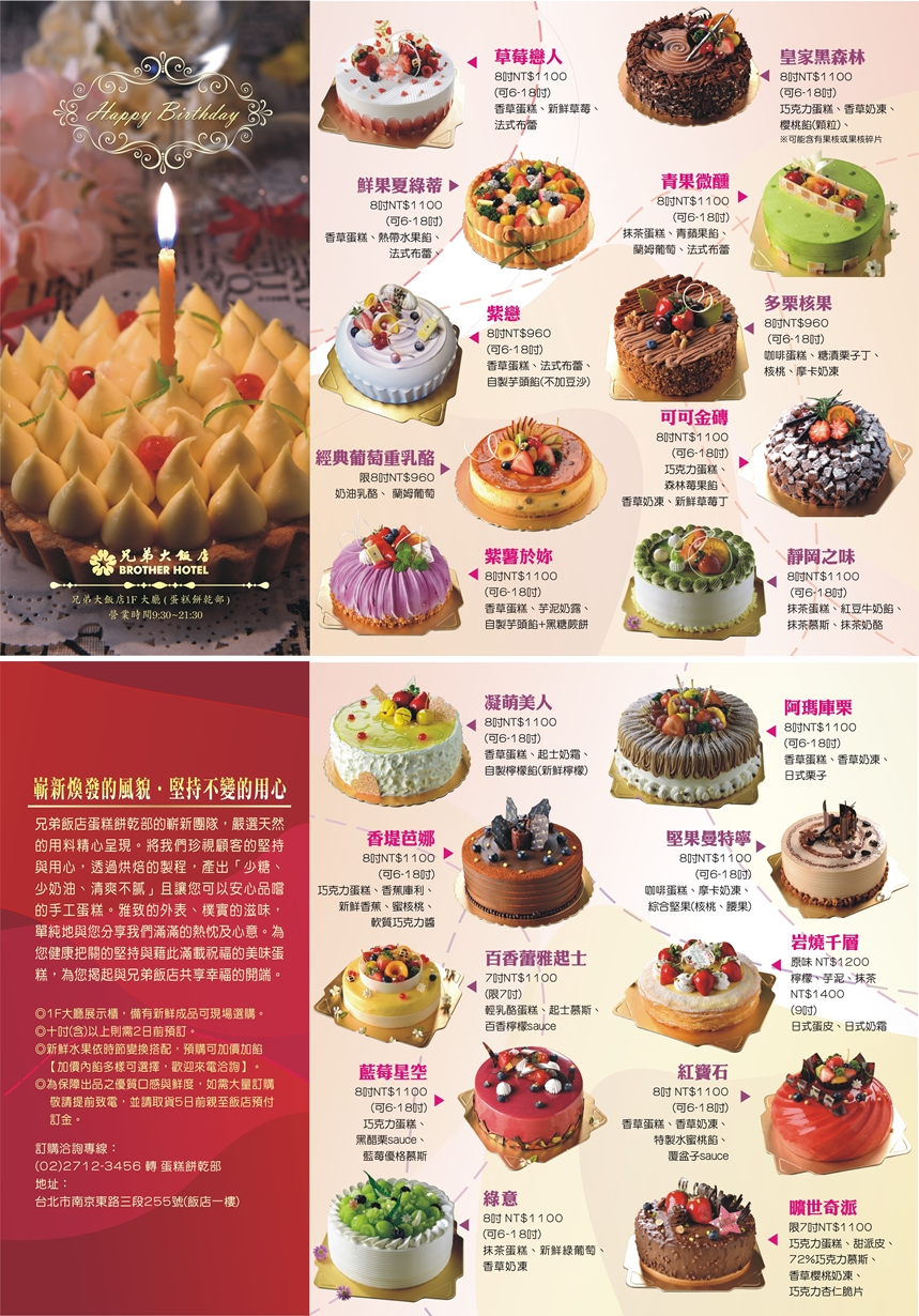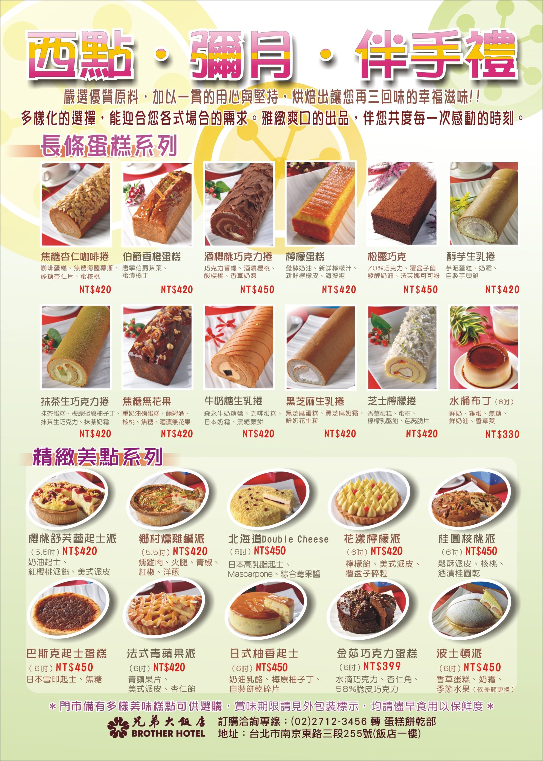 專業團隊嚴選天然的用料精心呈現,將兄弟飯店珍視顧客的堅持與用心,透過烘焙的製程,產出「少糖、少奶油、清爽不膩」且讓您可以安心品嚐的手工蛋糕。簡約的外表、樸實的滋味,單純與您分享我們滿滿的熱忱及心意。為您健康把關的堅持藉此滿載祝福的美味蛋糕,為您揭起與兄弟飯店共享幸福的開端。